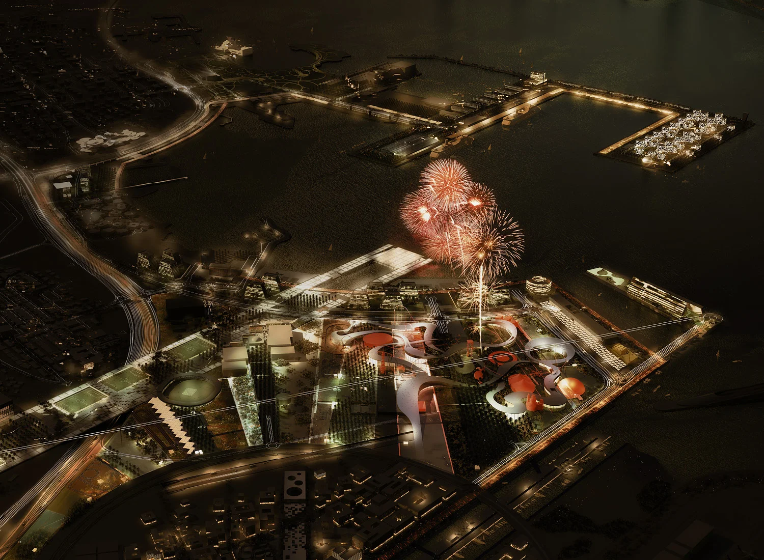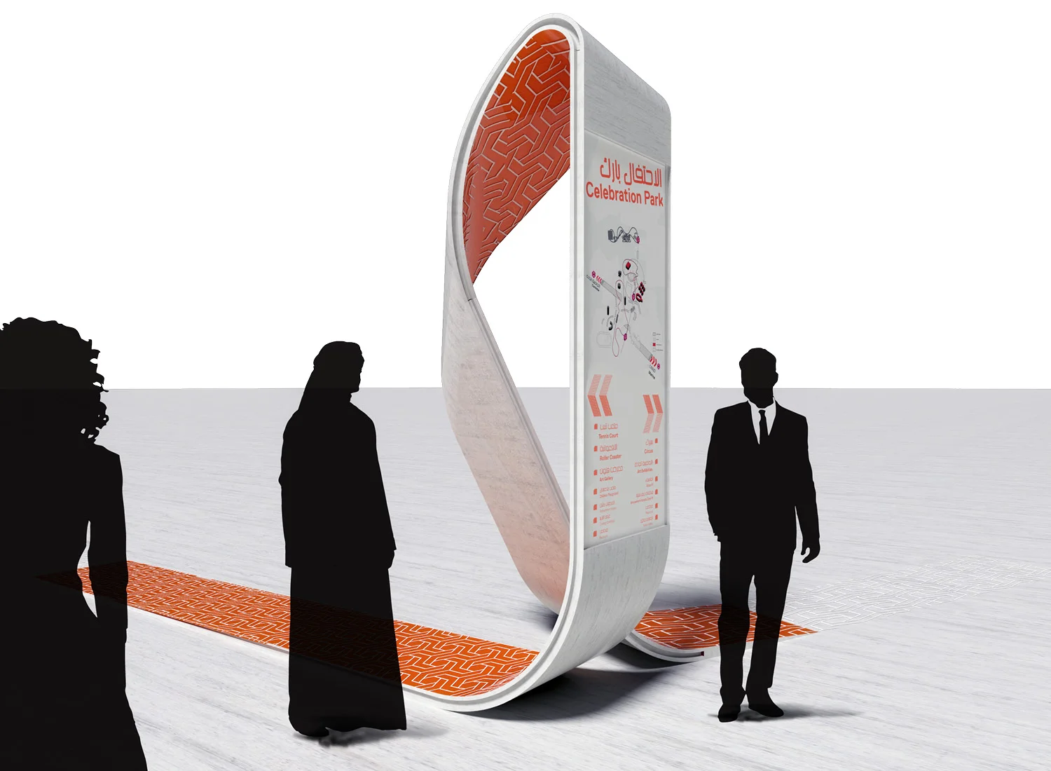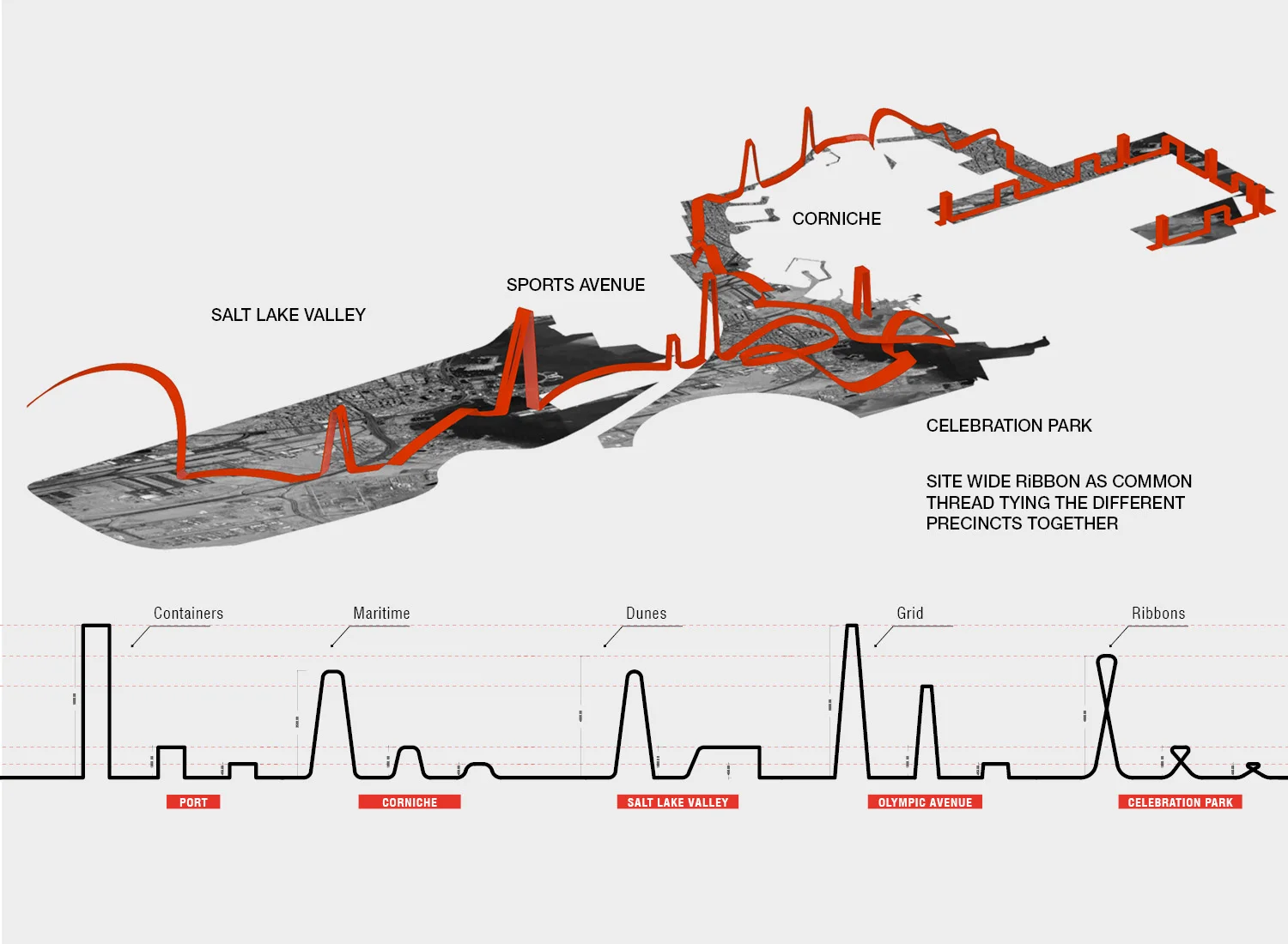 At 740ha the QCSH site represents a new piece of the city incorporating a redevelopment of the Old Port, an Amusement Park, a FIFA stadium and surrounding Olympic Avenue, an extension of the walkable Corniche and an Olympic rowing and training lake. In order to stitch together these disparate spaces and programmes, Spaceagency's solution was to propose a continuous band of information that weaves through the entire site, linking them perceptually into a single place. While the band adapts locally to the architectural and geographical character of the precincts, it still maintains a coherent identity, acting as a beacon of information to inform the visitor's journey.