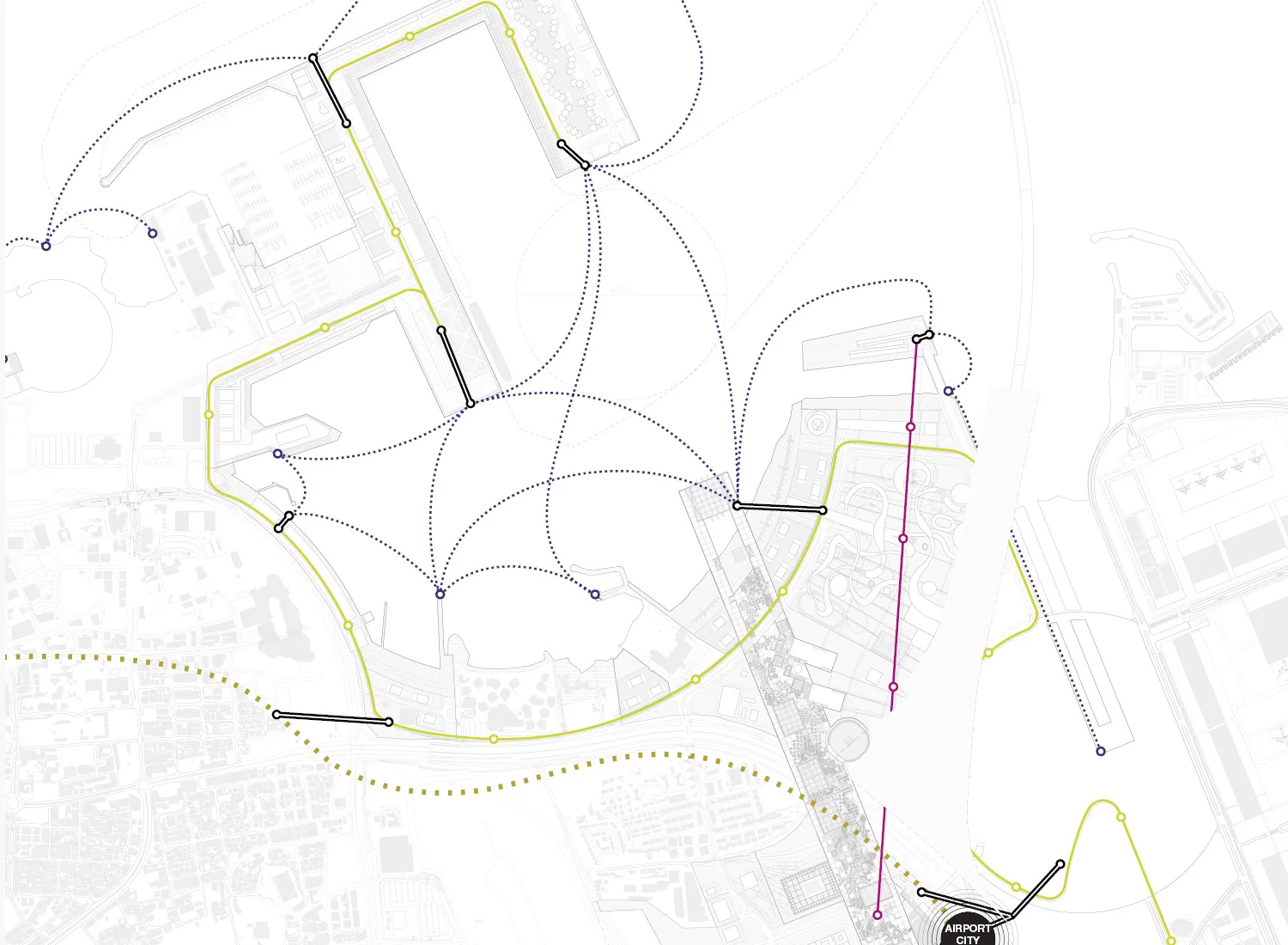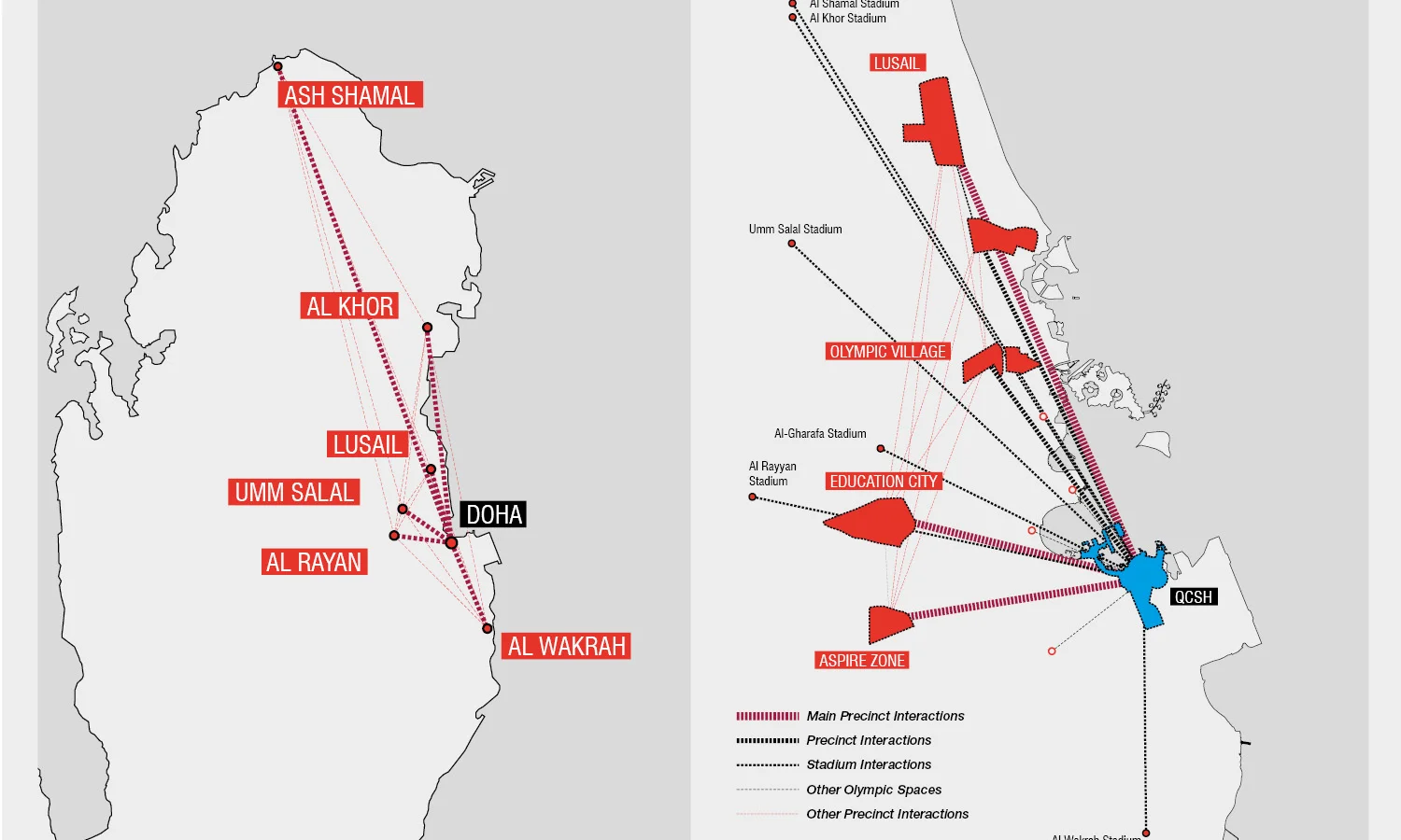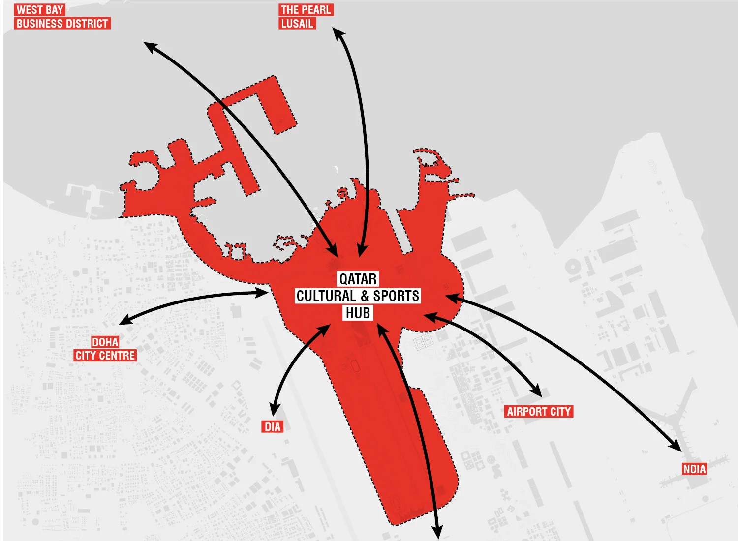 Located at the edge of Doha, the site for Qatar’s Cultural & Sports Hub is mostly vacant with very little development currently. The site is one of the locations of the 2022 World Cup and also planned as an Olympic venue as part of Qatar's bid for an Olympic Games. It is strategically located right outside the New Hamad International Airport, making QSCH a threshold between Qatar and the rest of the world. As a major transfer hub in the region, QSCH faces the unique opportunity to cater to world travelers; passengers with long layover times will have the possibility to jump on public transport and visit the attractions contained within QCSH. It will not only appeal to the local population, but has the potential to attract foreign visitors and even entice transfer passengers to stay in Doha. A first challenge of the project was to plan for all the routes and interchanges leading to the site that result from a planned people mover system consisting of the new Doha Metro, a tram, a cable car, a rail station, shuttle bus routes, water taxis, the cycle network and pedestrian routes, all requiring wayfinding and signage.