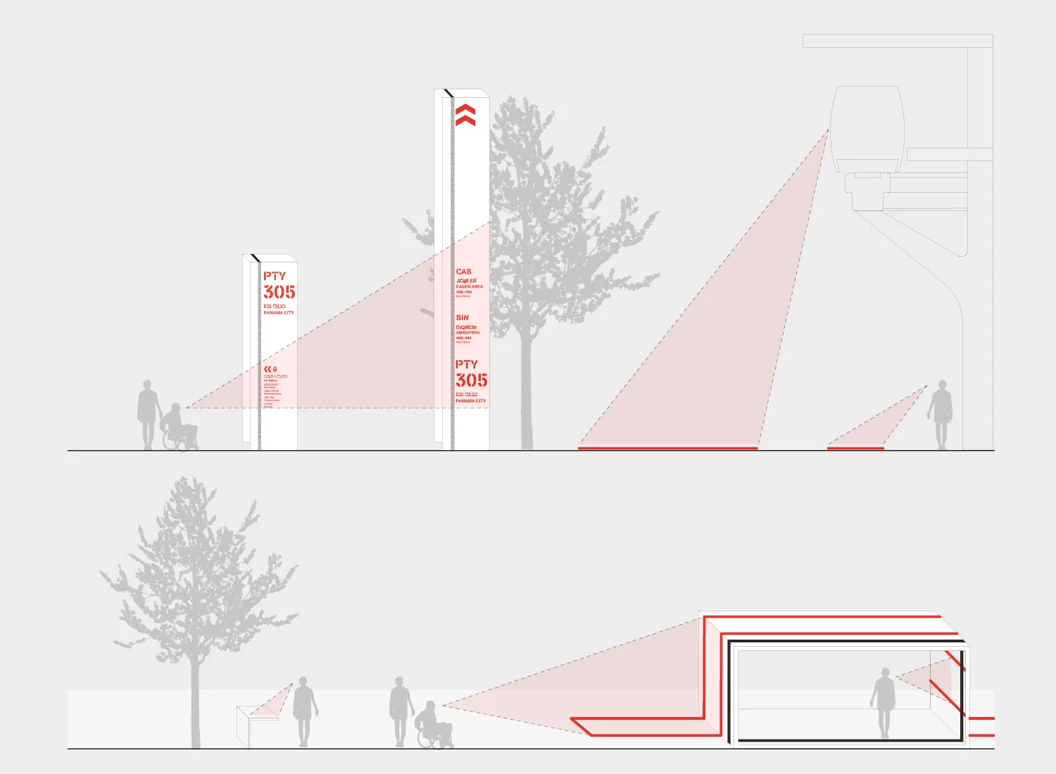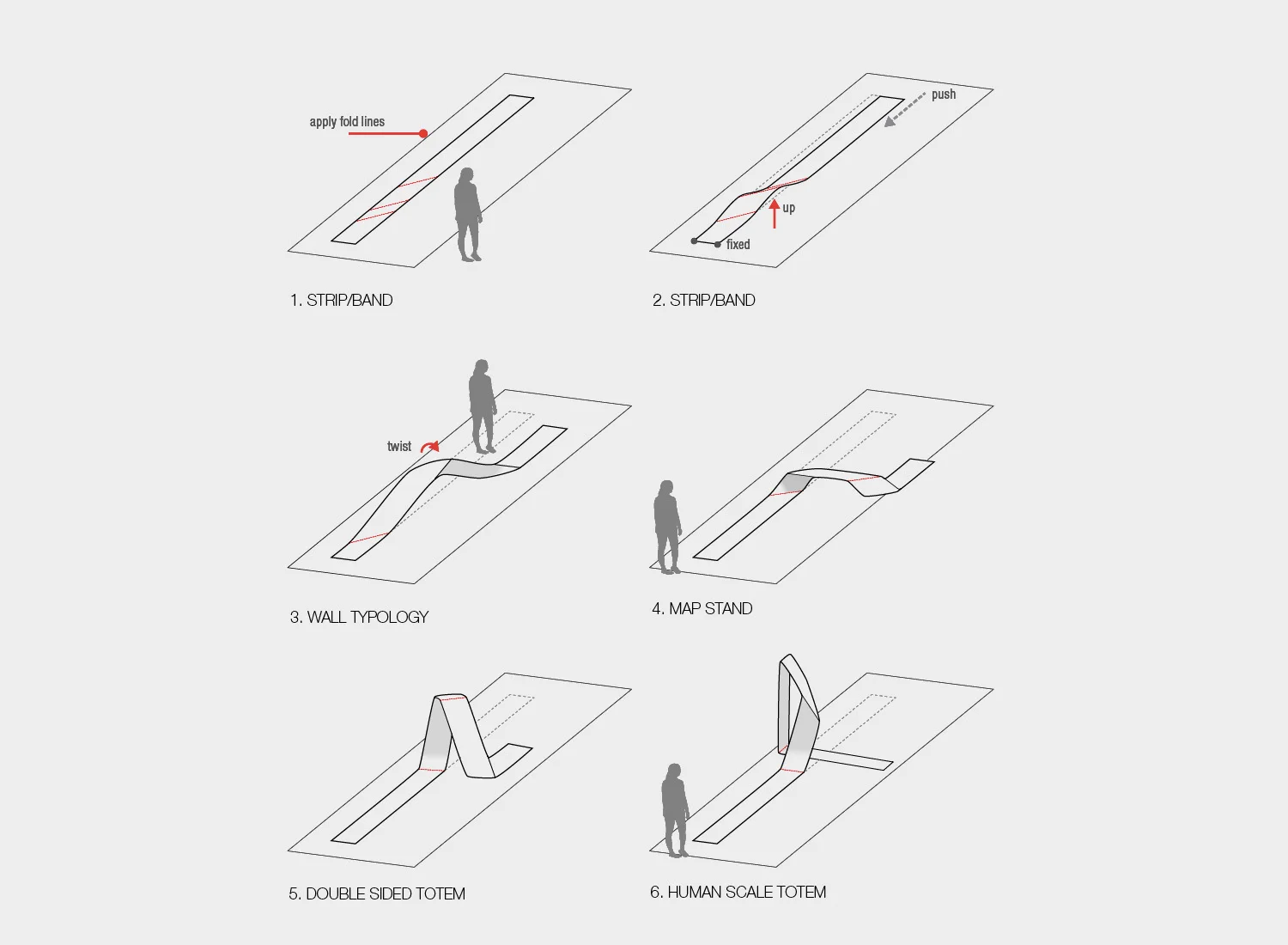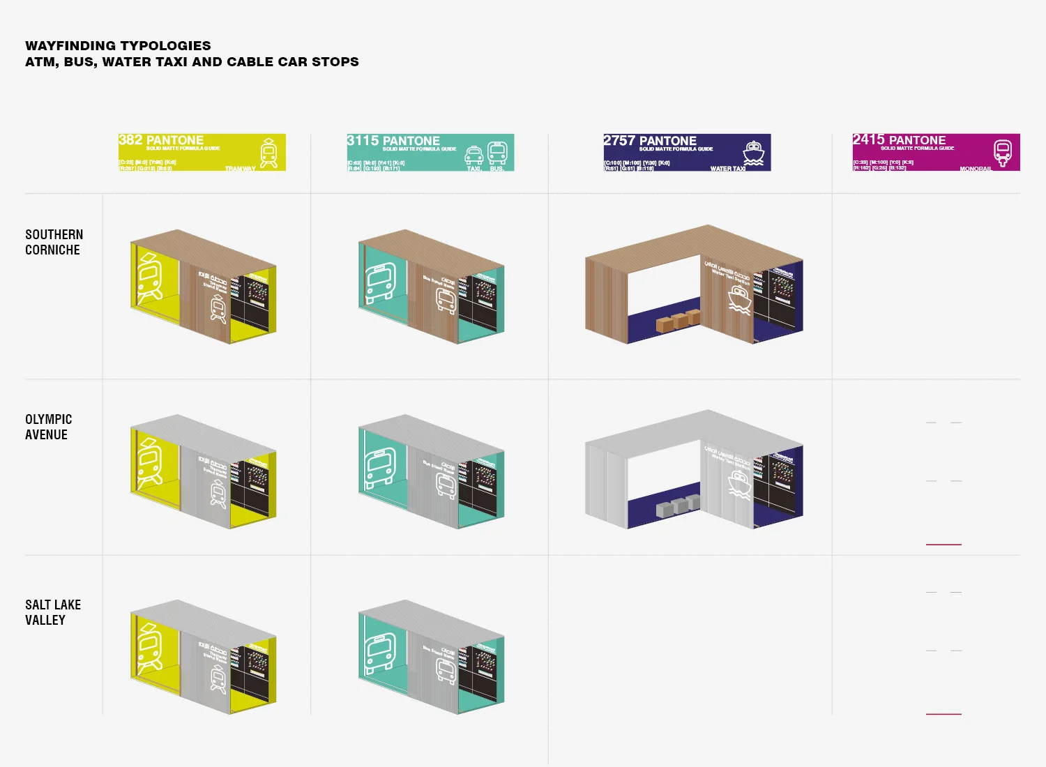 The band of information serves a series of informational purposes: wayfinding, providing directional guidance, identifying destinations, leading visitors in new directions, linking programmes and places. Each precinct contains certain base uses in addition to overlay programmes during the upcoming 'Event' and 'Super Event' modes. At the Old Port, OMA's design converts a container shipping port into an arts precinct with live-work studios and galleries. Using the shipping container form as inspiration, a series of wayfinding and informational elements have been designed which guide, inform, exhibit and frame the environment.