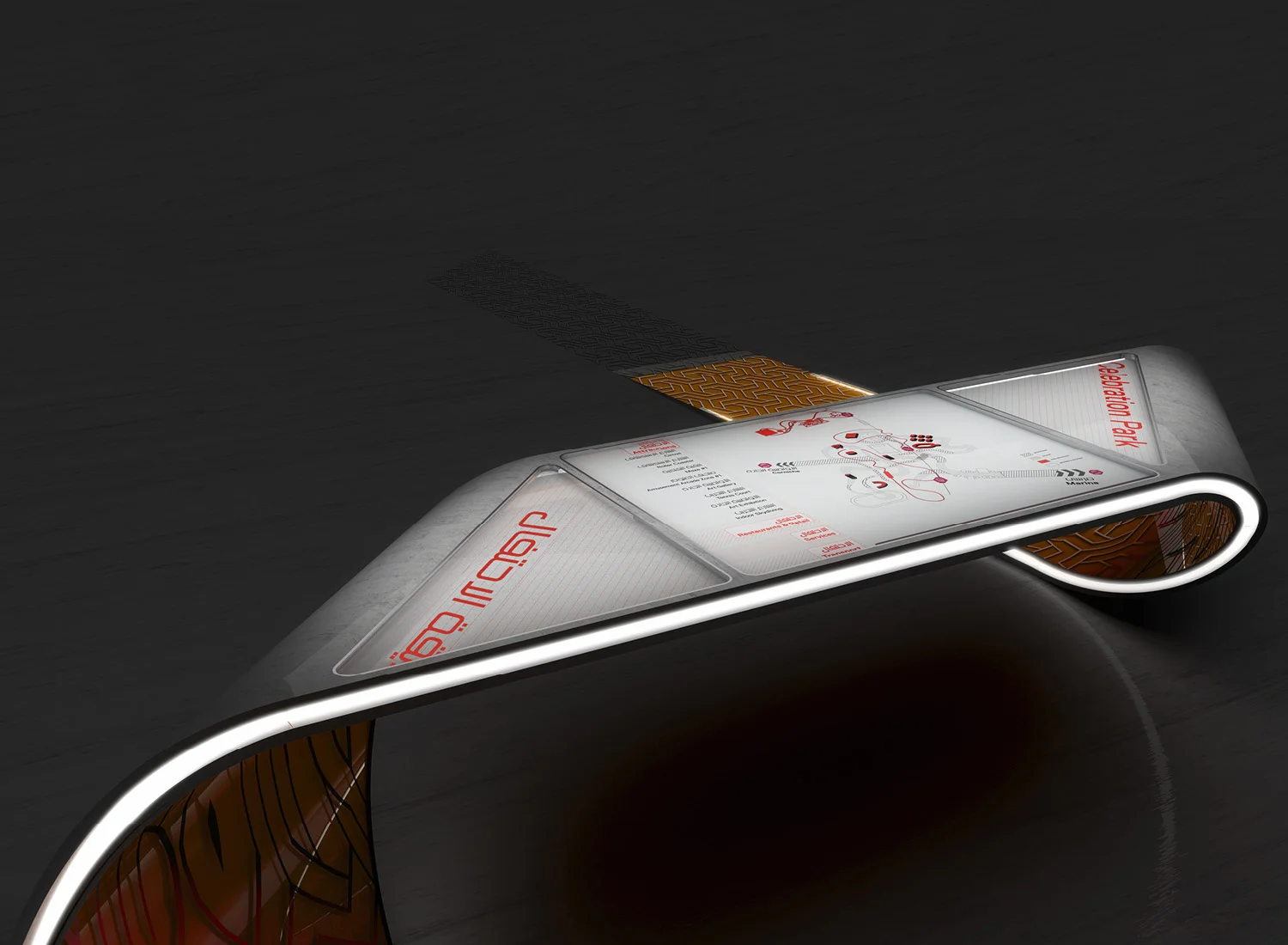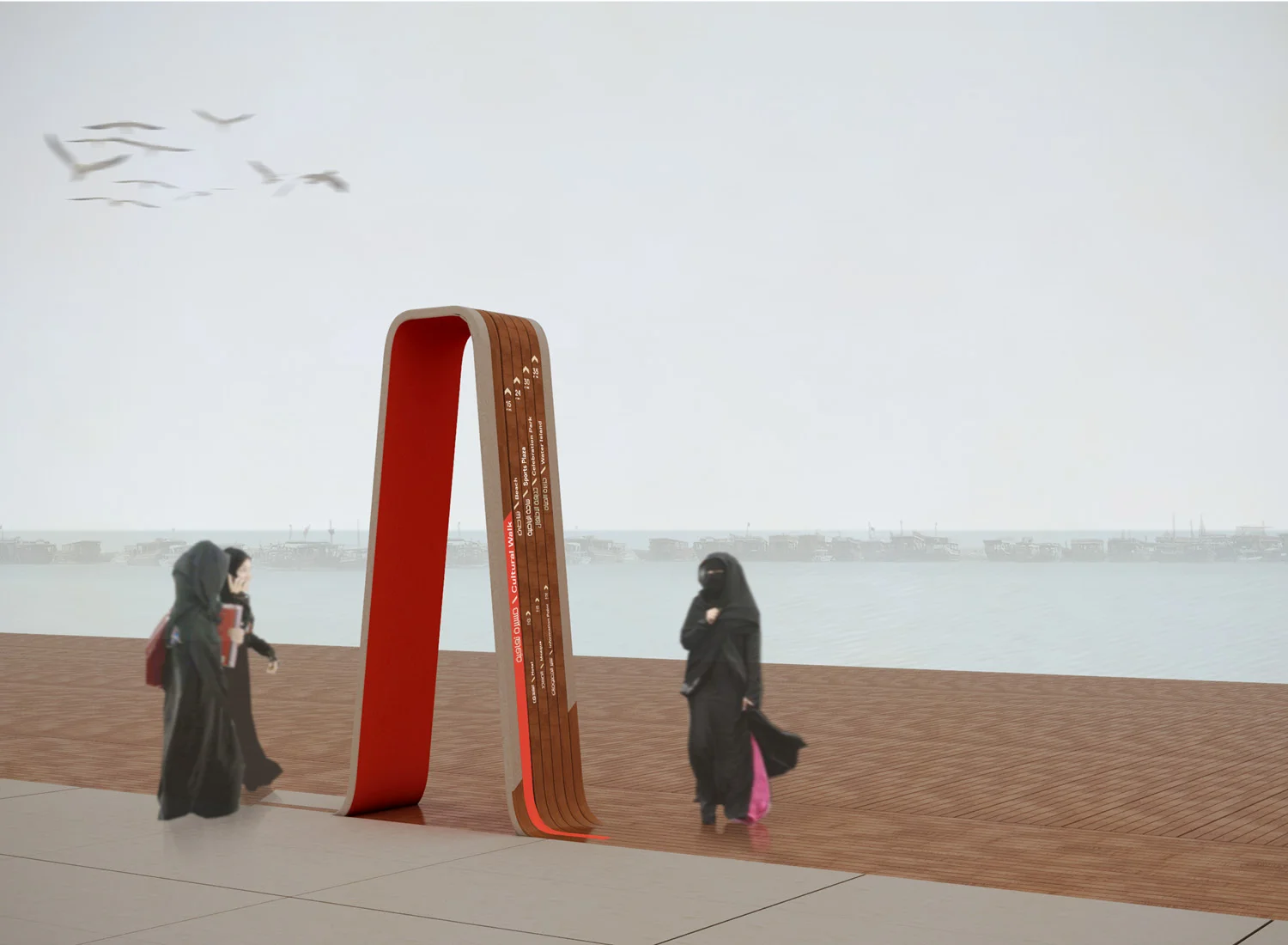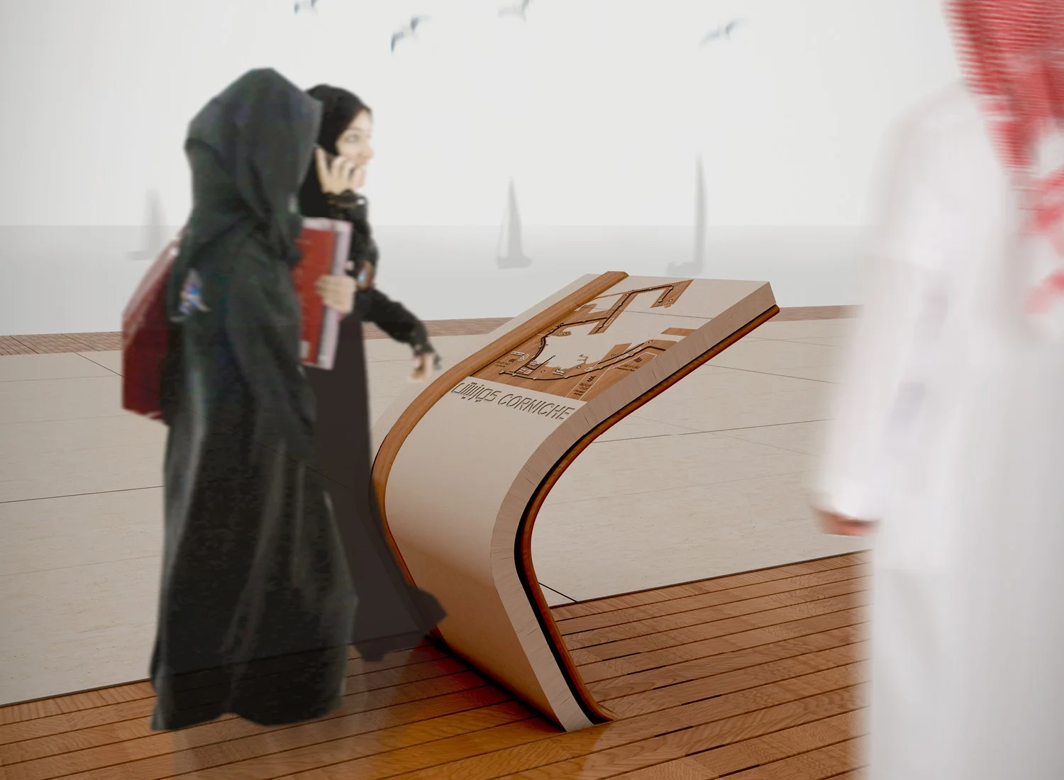As an extension of the popular, walkable Corniche in Doha, the Southern Corniche is the connective space between the Old Port and the sports and amusement precincts. The Corniche is designed as a boardwalk. Here the wayfinding band weaves up and down to create signage, seating and planters along the pedestrian and cyclists route.
