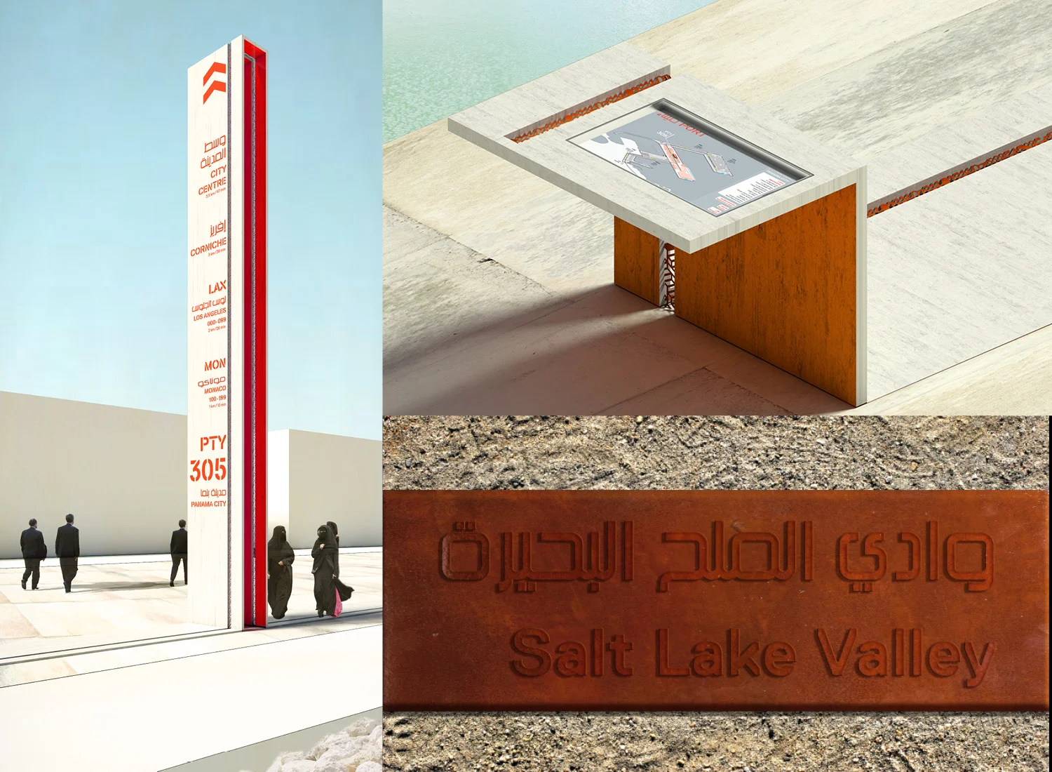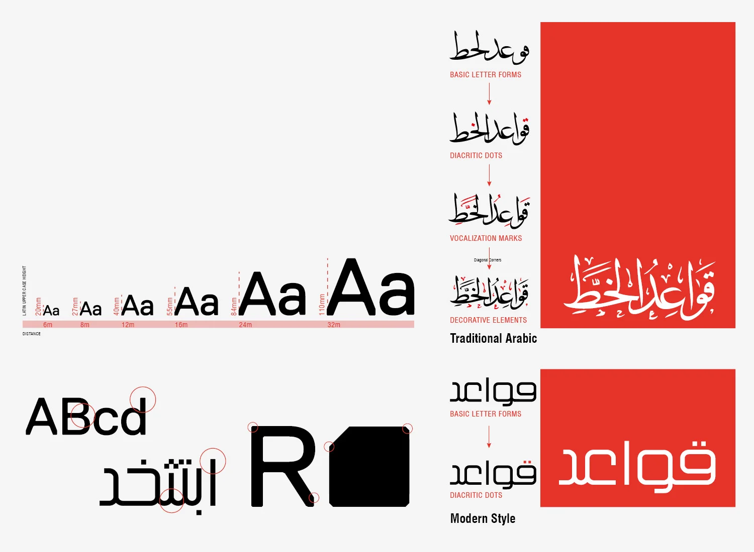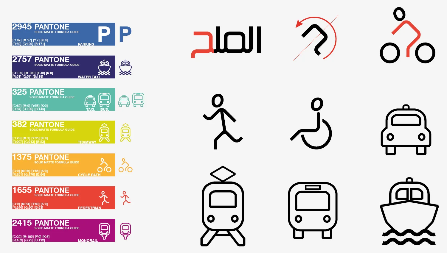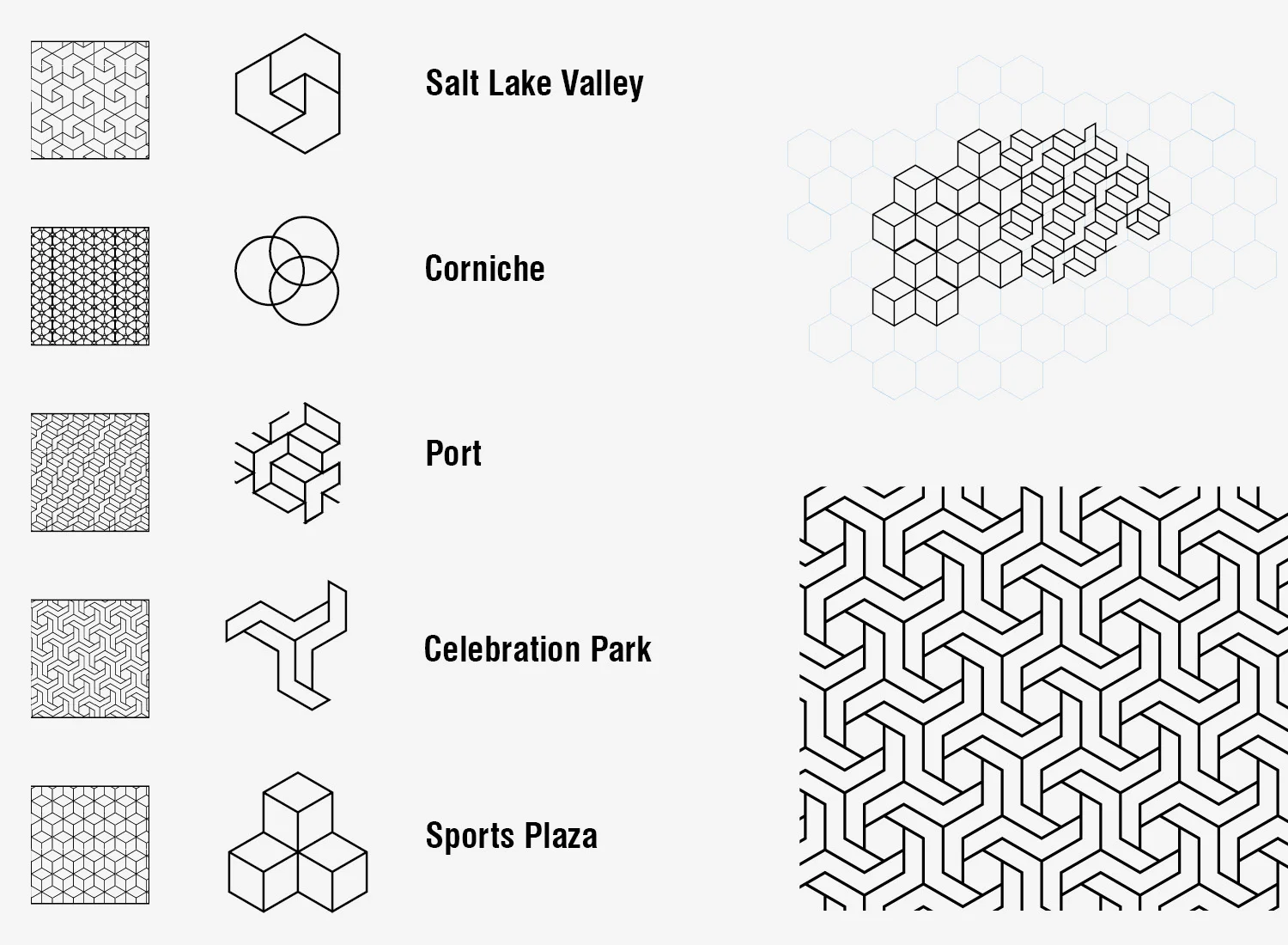 To create a coherent identity, a set of graphic and formal building blocks were designed which together form a recognisable visual language. The references for these elements were derived from the place itself and its intended use. The arabic language and local architectural expression was studied, in order to derive a language which would have meaning in its context. Each precinct was identified by a different pattern related to its use, which all fit into a hexagonal geometric base grid so they can easily morph between precincts. A modern, rounded arabic typeface was selected to communicate the sportive character of the site, and from the ligatures of letters, a set of symbols and pictograms were designed.