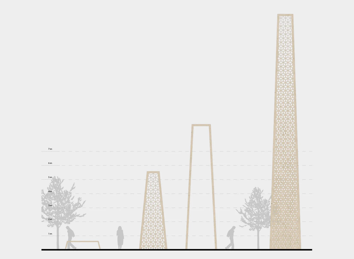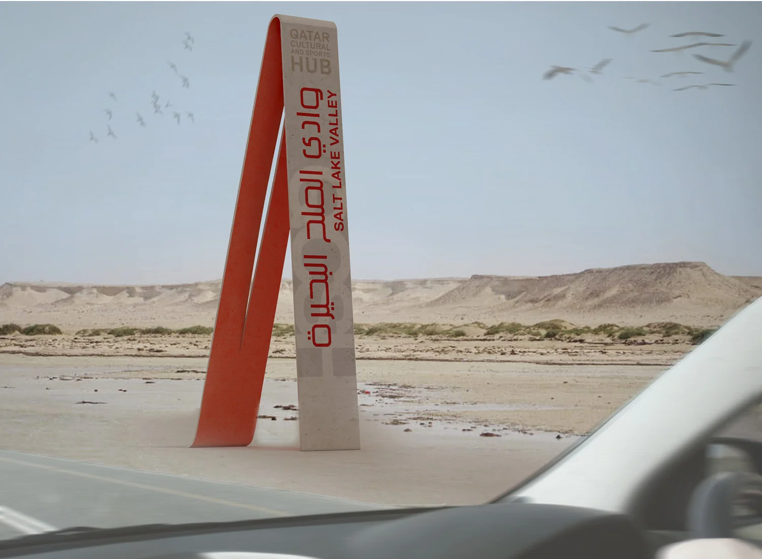 A rowing lake is to be constructed on the site of the old Doha International Airport, provided Olympic compliant rowing facilities in for the Middle East. In order to meet the water temperature standards for an Olympic lake, water will be pumped in from 5km out in the Gulf. The spoil of the lakes construction creates sand dune mounds where BMX cycling coexists with a new residential lakefront district. To counteract the great expanses of space and variable visibility due to the dunes, the wayfinding here is scaled up to become beacons within the public space.