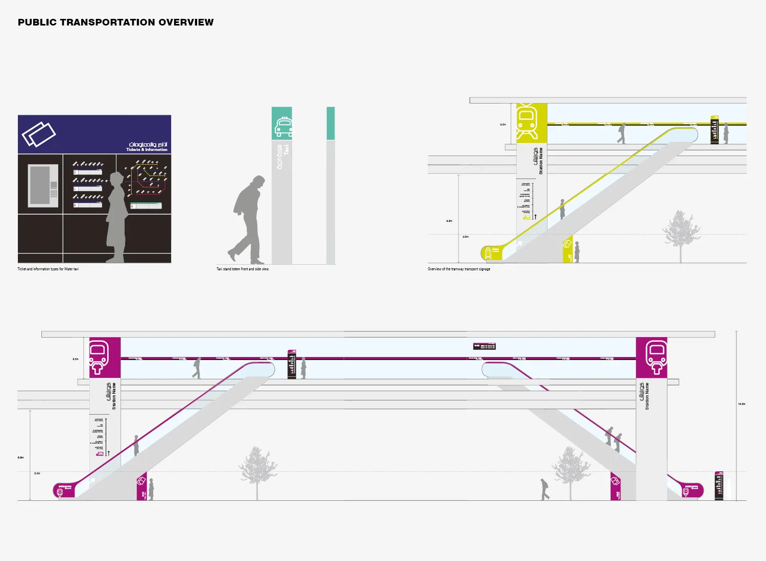 A variety of transportation modes are planned to work as a comprehensive people mover system at QCSH. Each is coded with a distinct colour and large recognisable icon. Signage has been designed to integrate completely into the architecture, at once both highly visible and unified as a coherent system, where information can be found consistently in same locations for each mode.